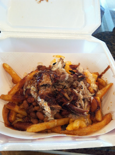 Give up? The Hoffinator is ranch and barbeque sauce on pulled pork on mac and cheese on baked beans on fries: six layers of comfort food heaven.